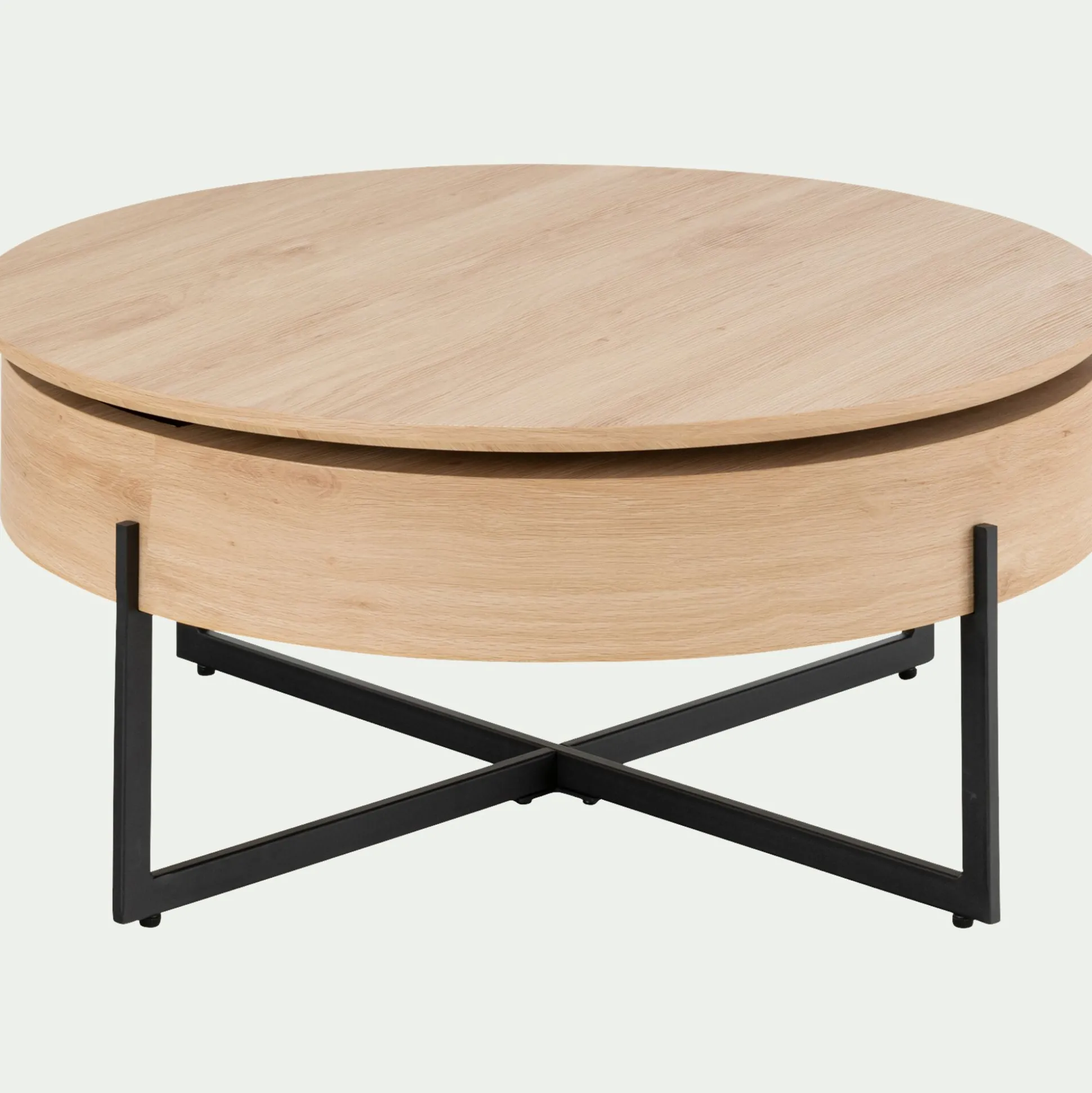 Optimisez votre salon avec la table basse Choucas. Cette table basse en bois comporte un caisson de rangement, dissimulé sous son plateau rotatif. Grâce à ce nouvel espace de rangement, votre séjour est mieux organisé. En bois clair, cette table basse ronde participe à une atmosphère naturelle et chaleureuse. Pratique et esthétique, c’est une pièce centrale du salon. Son piètement en métal noir croisé apporte du contraste à l’ensemble : la touche finale d’une meuble simple et au charme irrésistible.