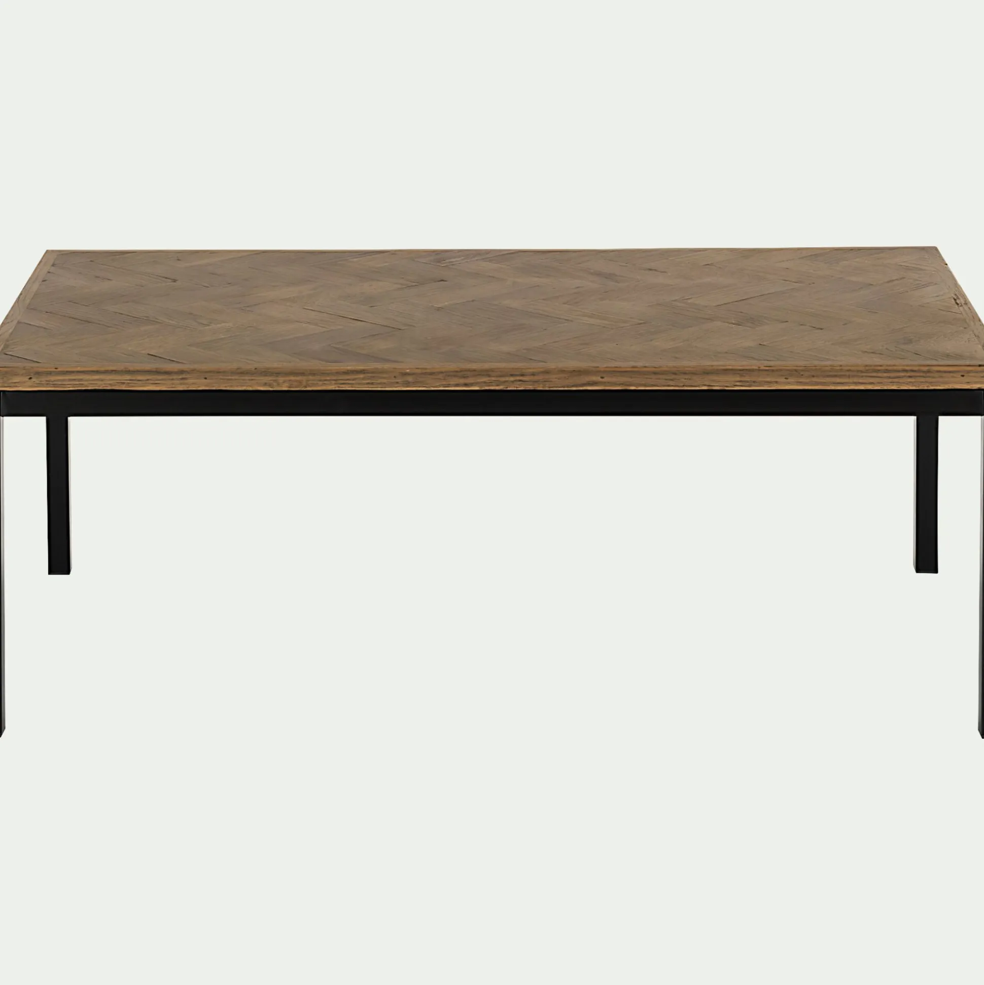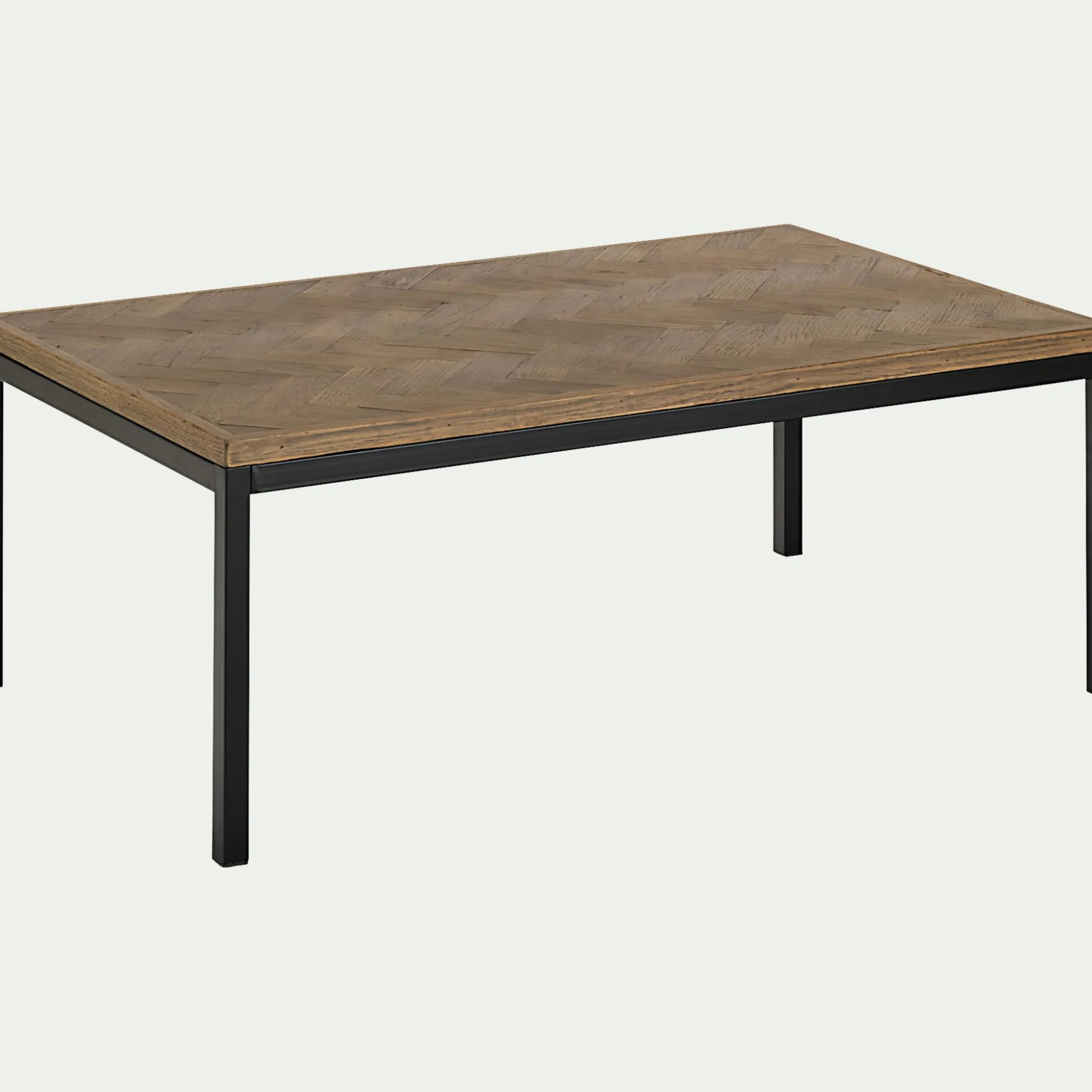 Cette jolie table basse rectangulaire trouvera aisément sa place dans votre salon. Vous serez séduit par cette association de matériaux. Le bois foncé du plateau et le métal noir des piètements se marient à la perfection pour vous proposer un meuble au design brut. Pour un style plus authentique, elle pourra se mixer avec un canapé en cuir et des matières comme le bois brut ou le métal brossé. Elle s’adaptera à tous les intérieurs et y apportera du cachet.