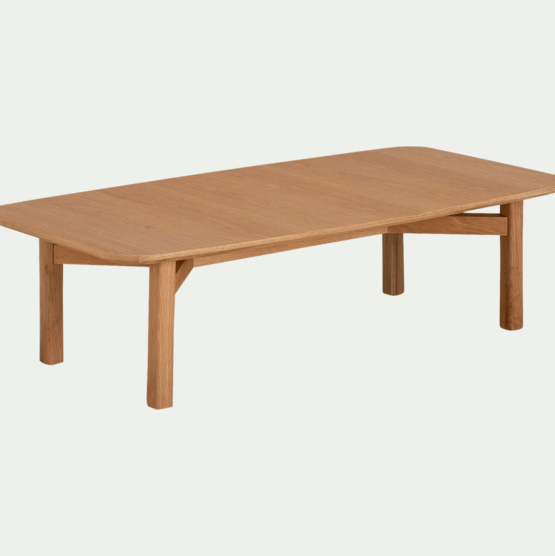 Cette table basse rectangulaire en plaqué chêne arbore un design sobre et chic. Ses pieds en bois massif légèrement en compas et ses angles arrondis apportent à ce meuble de salon style et un charme incontestable. Ce mobilier apportera du cachet à votre intérieur. Placée sur un beau tapis près de votre canapé, cette table basse marquera la déco de la pièce.
