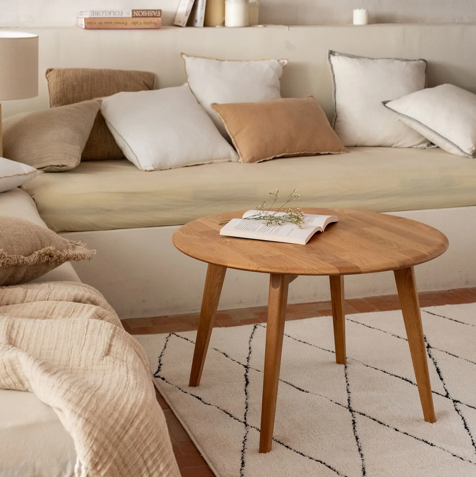 Lagos est une petite table basse pensée pour convenir à tous les styles d’intérieur. D’une grande simplicité, elle se présente sous la forme d’un plateau rond et de trois pieds. L’ensemble est fabriqué dans du bois massif et plus particulièrement dans du chêne. Cette essence de bois est reconnue pour être résistante. Elle offre à ce meuble de salon un coloris clair, arboré de quelques veinures plus sombres pour un rendu naturel. Cette table basse ronde est ensuite vernis pour assurer sa longévité. De 46 cm de hauteur, cette table basse en chêne se combine aux deux autres tables Lagos pour un rendu gigogne.