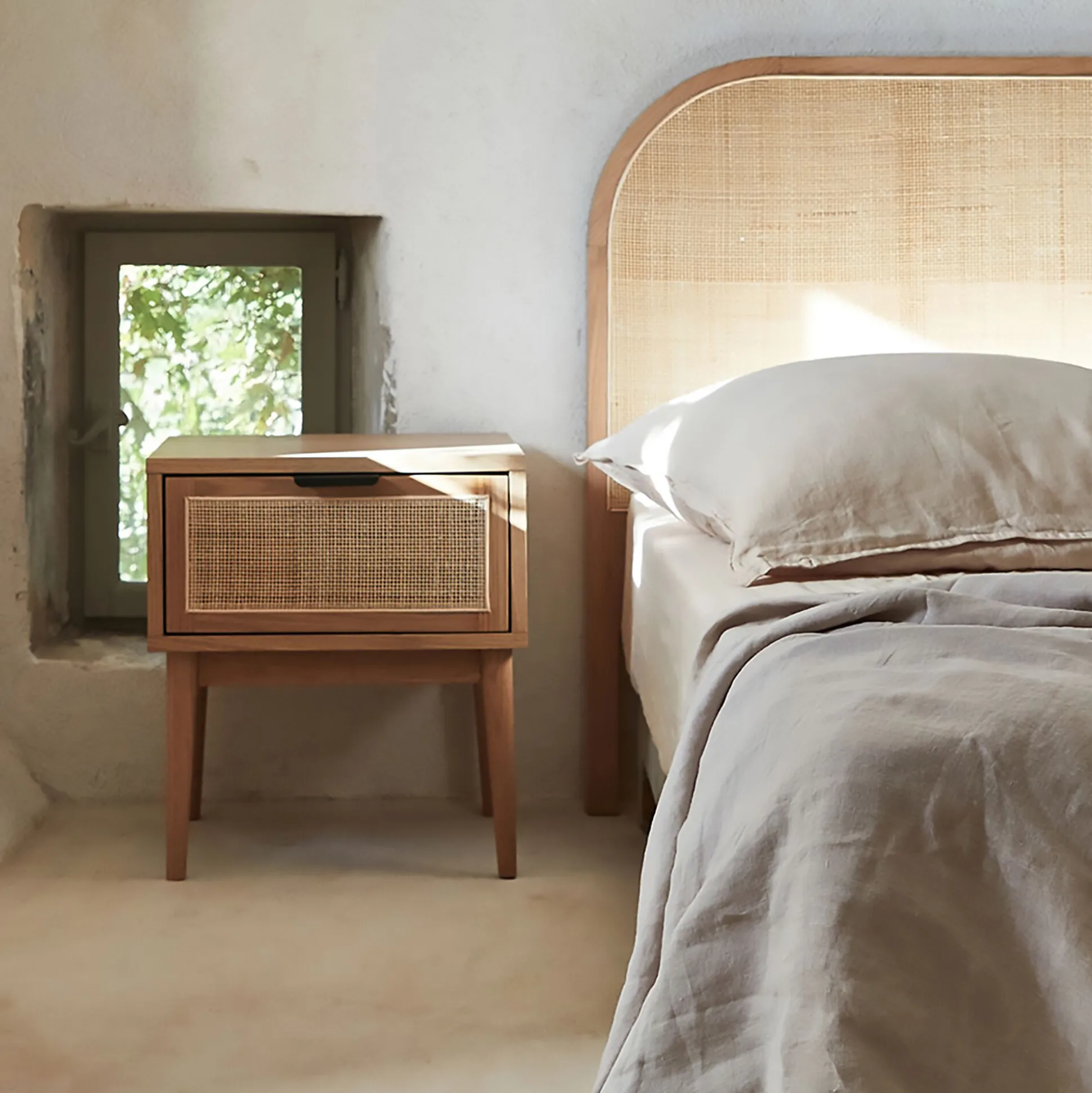 Réchauffez la décoration de la chambre avec cette table de chevet en bois et cannage. La structure en chêne massif arbore un coloris clair, orné de fines veinures. Brut et authentique, ce cadre s’accompagne d’une finition en cannage et d’une poignée noire. Simple mais design, cette table de nuit peut accueillir votre lampe de chevet, un livre, une plante, des cosmétiques… Dans son tiroir coulissant, rangez quelques affaires et profitez d’un intérieur propre et ordonné.