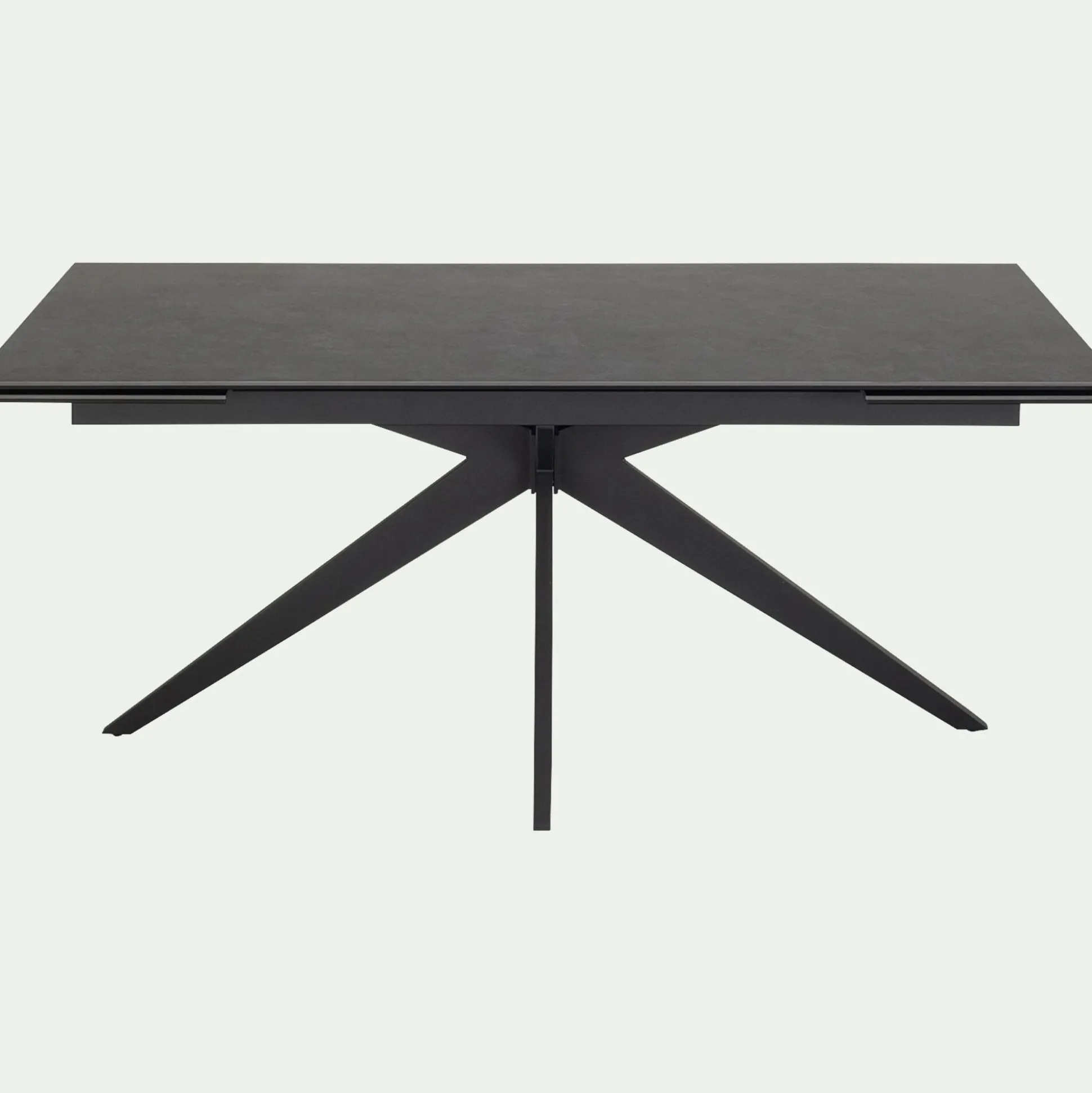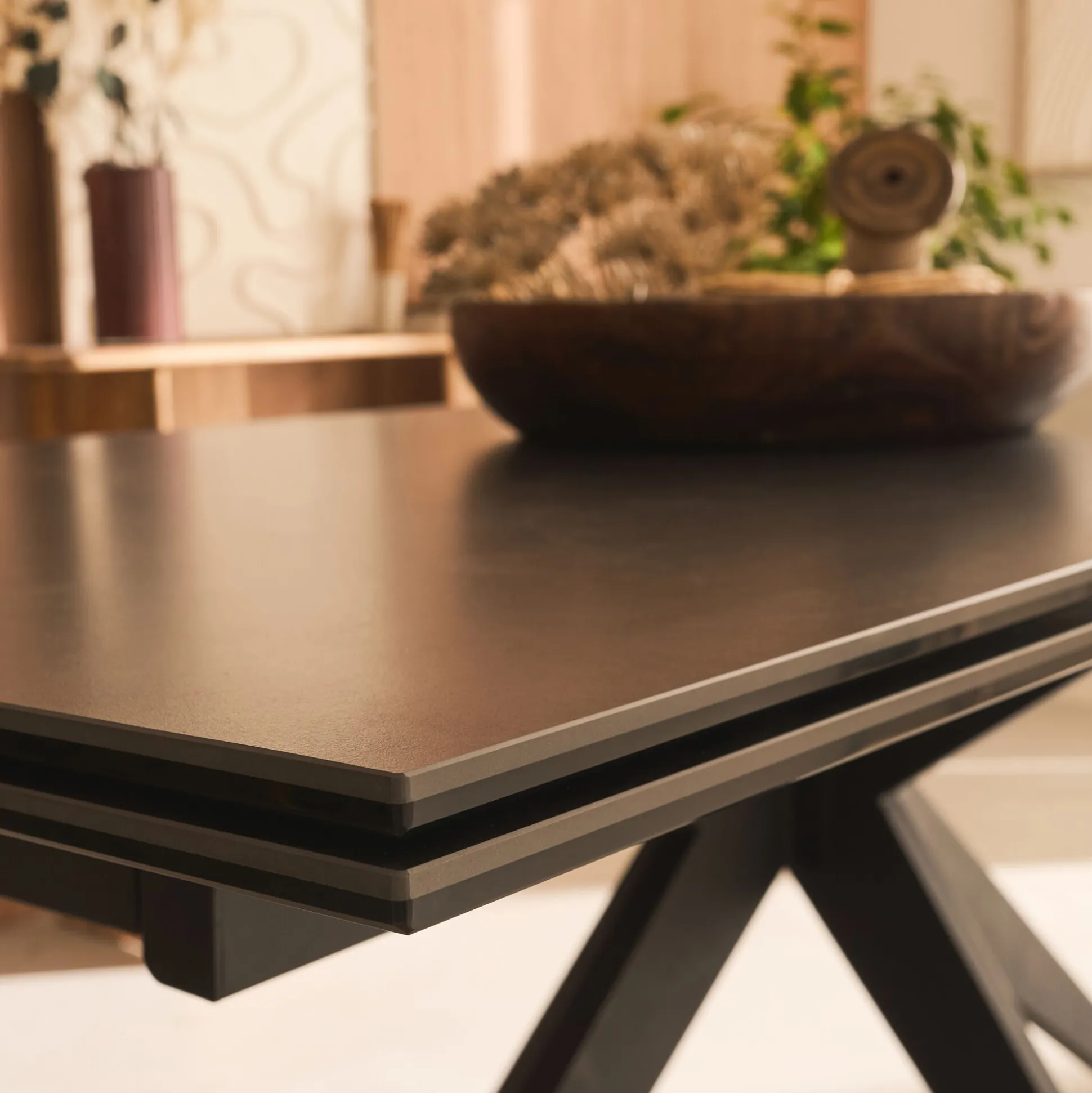 Avec son design contemporain tout en noir, cette table de repas extensible allie élégance et fonctionnalité. Son plateau associe la résistance de la céramique à la solidité du verre trempé, tandis que son piètement en métal dessine une silhouette graphique et moderne. Longue de 180 cm au quotidien, elle s’adapte aux grandes tablées grâce à deux rallonges indépendantes pour atteindre jusqu’à 260 cm. Faciles à mettre en place, elles permettent d’accueillir confortablement jusqu’à 10 convives. Une table aussi belle que pratique pour recevoir sans compromis.