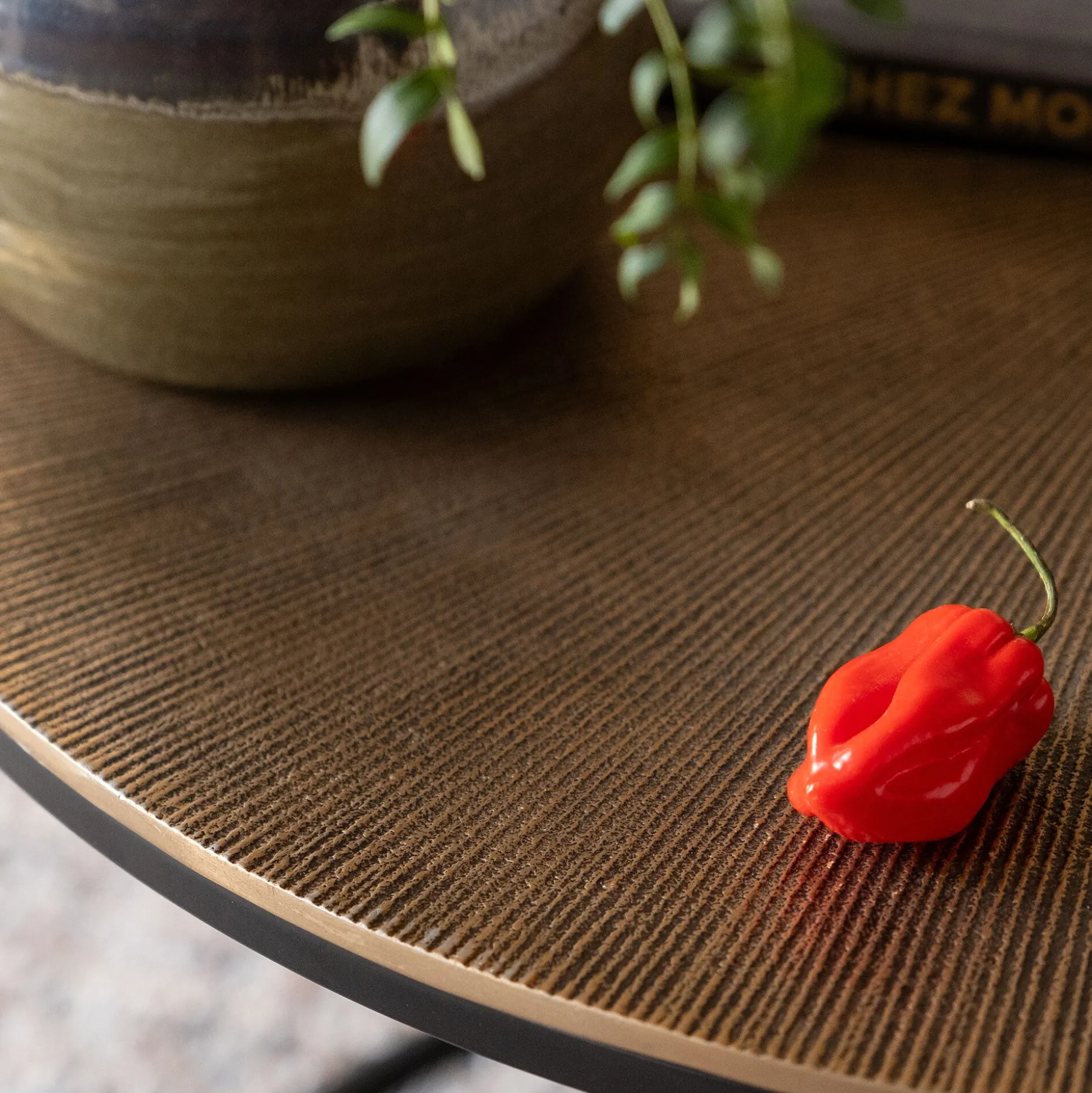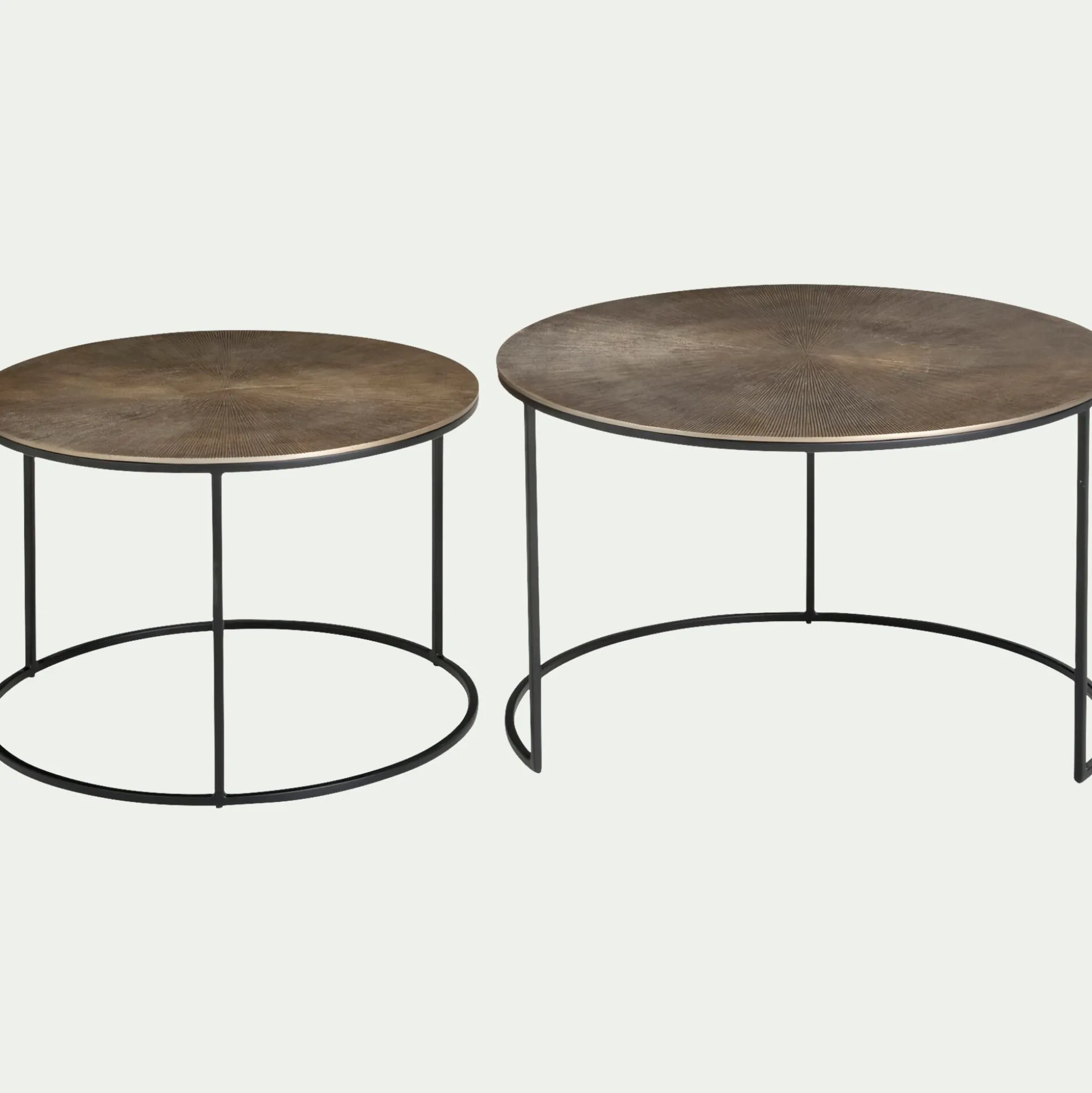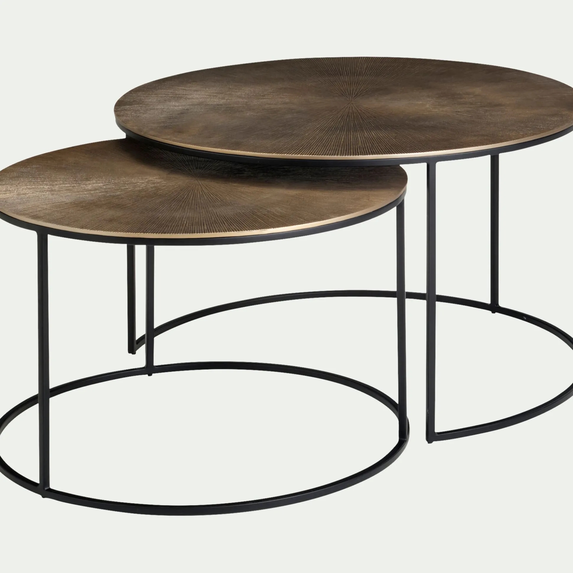 Cet ensemble de deux tables basses gigognes marie avec élégance le raffinement et la fonctionnalité. Chaque table présente un plateau rond orné de stries en relief, créant un motif qui captive le regard. Le plateau, au coloris doré patiné, évoque un esthétique vintage et sophistiquée, semblant témoigner du passage du temps avec élégance. Posées sur des piétements en métal noir, ces tables renforcent le caractère contemporain du salon.