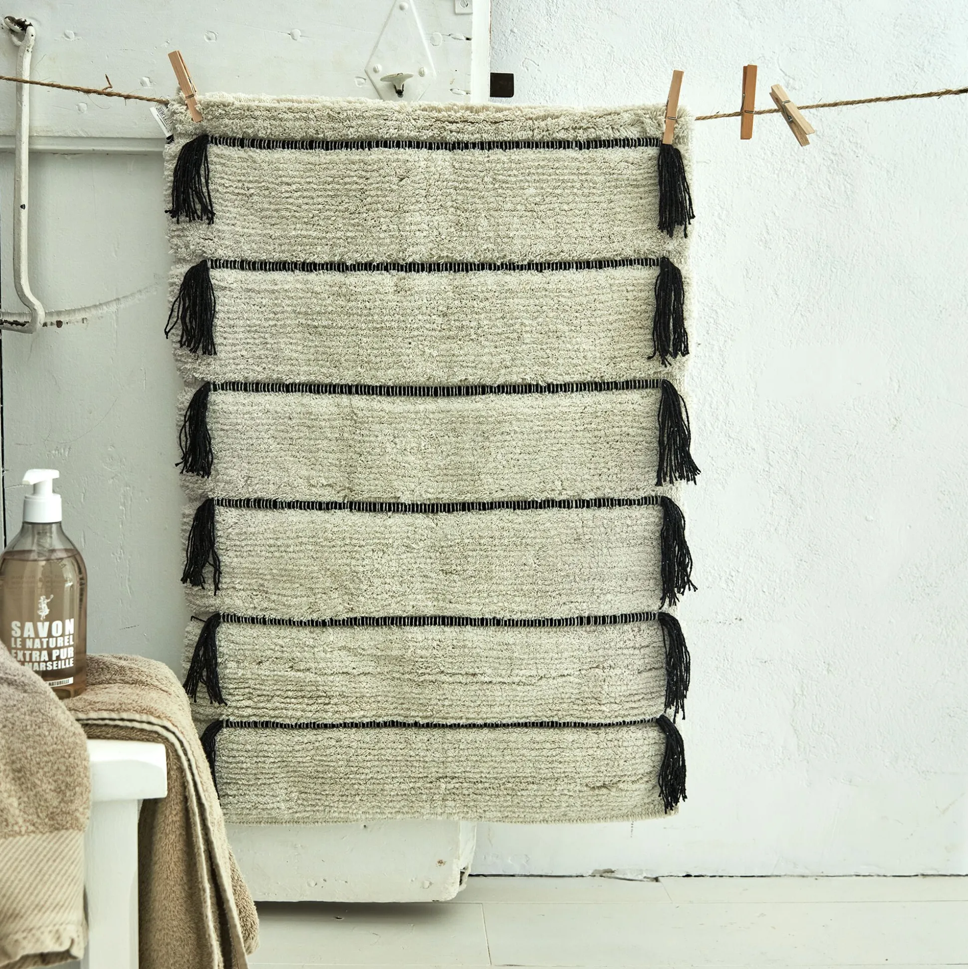 Gourdon est un tapis de bain intemporel, twisté par une petite touche contemporaine. Ce tapis de bain en coton arbore une palette de couleurs épurée. Grand classique, le noir et le blanc se marient à merveille pour donner du contraste à cette pièce. De fines rayures noires parcourent ce tapis de salle de bain. A la fin de leur chemin, elles éclosent en de gros pompons, touche fantaisie qui apporte du volume et du dynamisme. Ce tapis de bain noir et blanc est une décoration moderne, aussi esthétique que pratique.