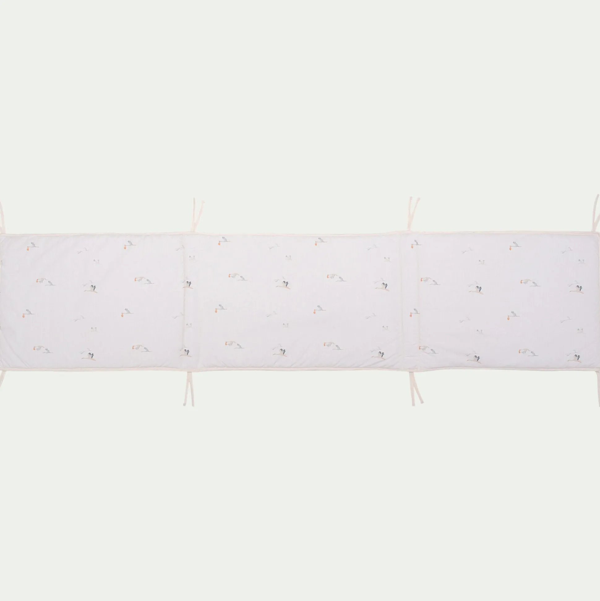 Ce tour de lit, conçu pour un lit bébé à barreaux de 60×120 cm, allie sécurité et douceur. En coton bio, il offre un contact naturel et respectueux de la peau délicate de bébé. Son motif de cigognes en plein envol, imprimé sur un fond blanc apaisant, crée une ambiance sereine propice au repos. Placé autour des barreaux, le tour de lit protège bébé des chocs et évite les courants d’air, tout en apportant une touche décorative harmonieuse à la chambre.