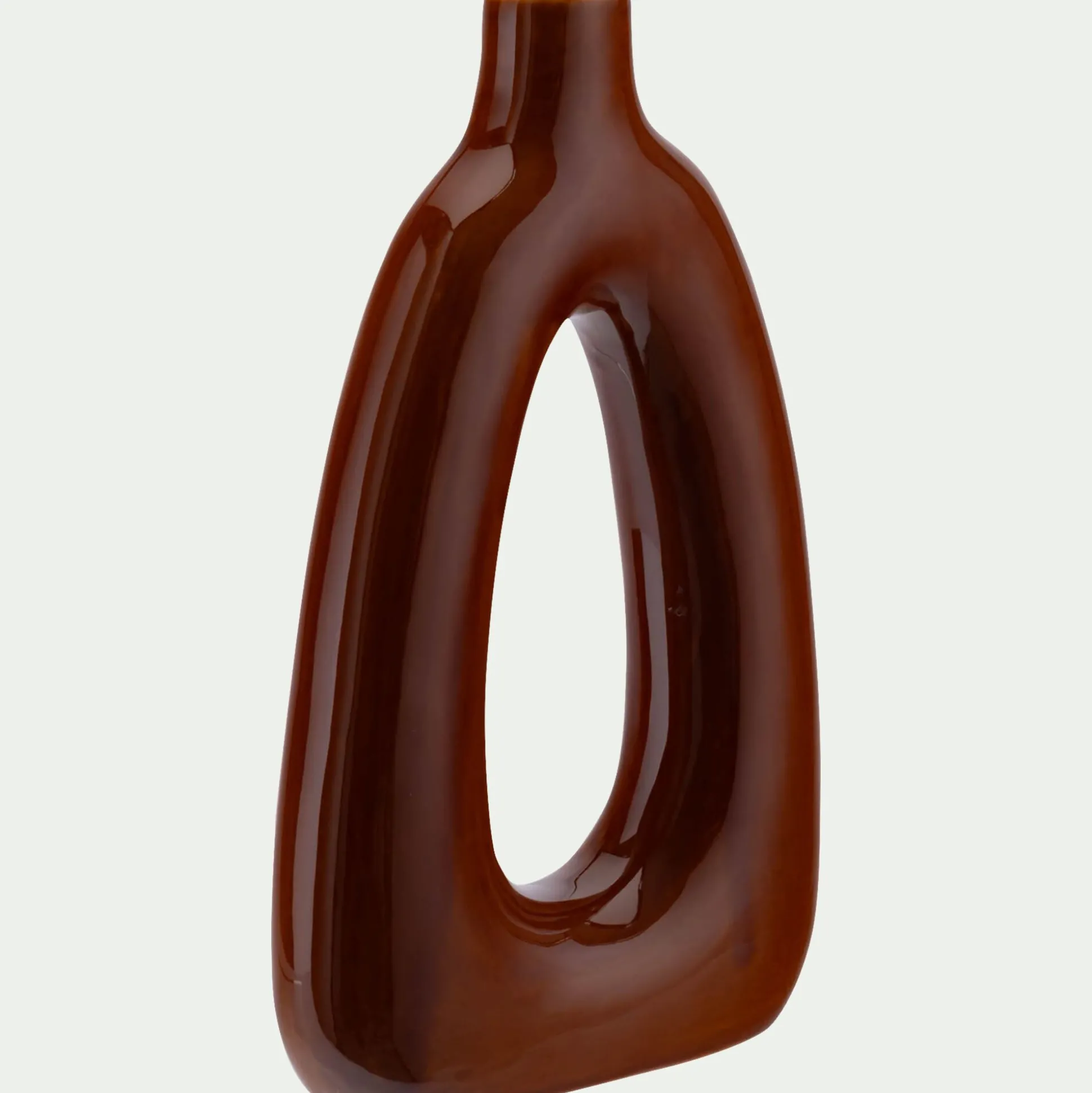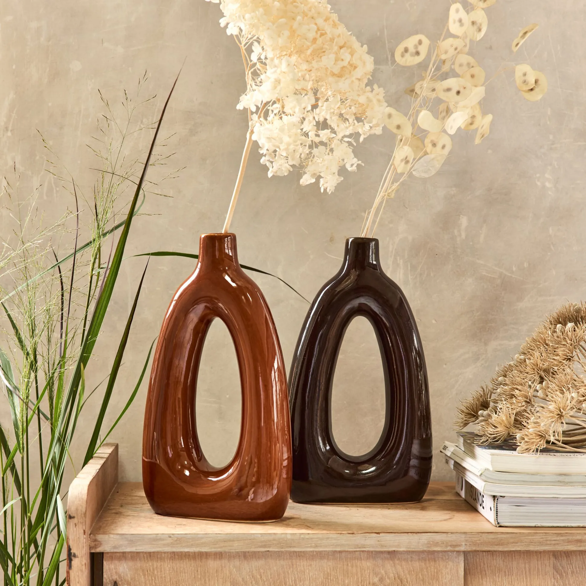 Découvrez cet assorti de vases en céramique marron émaillée qui dévoile une silhouette singulière, véritablement sculpturale et qui attire le regard. Leur forme organique et le passage ajouré au centre apportent une touche de modernité subtile à votre décoration. La richesse du coloris marron glacé, brillant et profond, réchauffe l’atmosphère de la pièce. Pièce de déco à part entière, ils sublimeront un buffet ou une étagère en toute simplicité. Conçus en porcelaine, ces vases assurent une belle robustesse pour accueillir vos plus beaux bouquets de fleurs séchées, ou être exposé comme un objet d’art contemporain. Il s’associe élégamment à des teintes naturelles et des matières minérales pour une ambiance très actuelle.