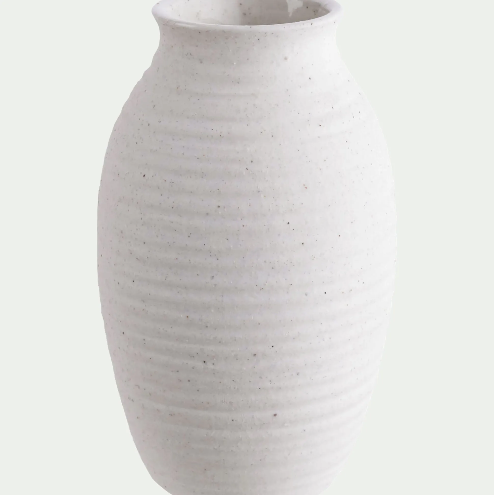 Ce vase en grès blanc se distingue par sa silhouette élancée et son allure organique. Sa texture striée et parsemée de subtiles taches foncées lui confère une âme rustique et authentique, évoquant une création faite à la main. Parfait pour mettre en valeur un bouquet séché, il est aussi une pièce de décoration singulière posé à même le sol ou sur un meuble bas. Ce vase s’intègre naturellement dans une décoration d’inspiration naturelle, où la simplicité des matières premières est mise à l’honneur.