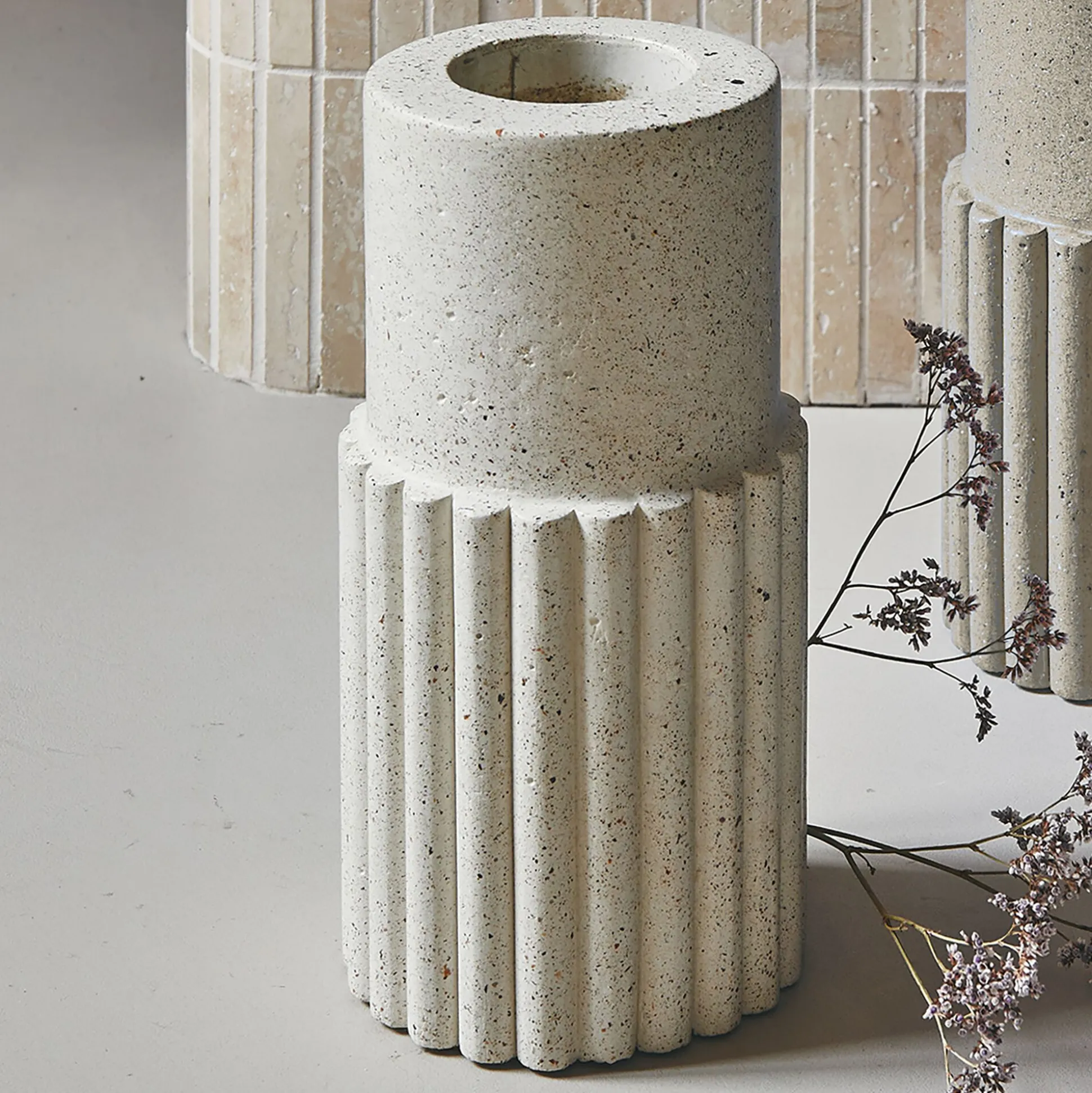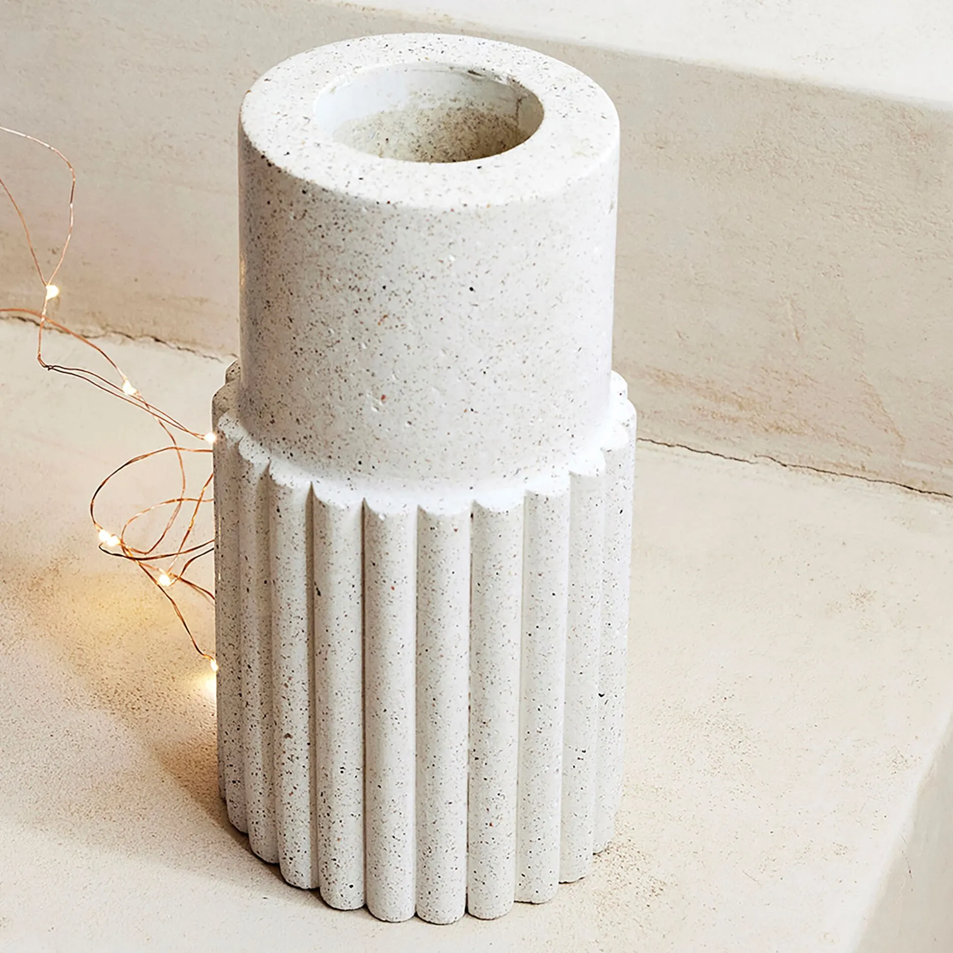 Ce vase en béton blanc célèbre la beauté des imperfections, transformant la matière brute en un bel objet déco. Inspiré du style terrazzo, il mêle avec élégance des fragments de pierre pour créer une texture unique et organique. Les détails en relief donnent du volume à ce vase et participent à un style contemporain. Parfait pour mettre en valeur un bouquet de fleurs ou simplement en tant qu’objet décoratif, ce vase apporte une touche de caractère et d’authenticité à votre intérieur.